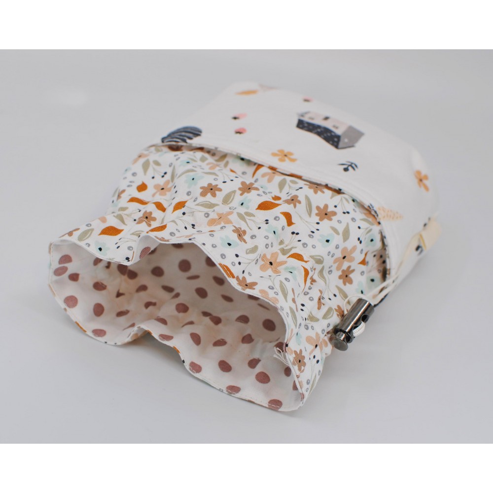Der Beutel aus Baumwolle mit abgestimmten Stoffen in weiß, rosa, creme und braun ist voll gefüttert und wird mit einem Druchzugband geschlossen