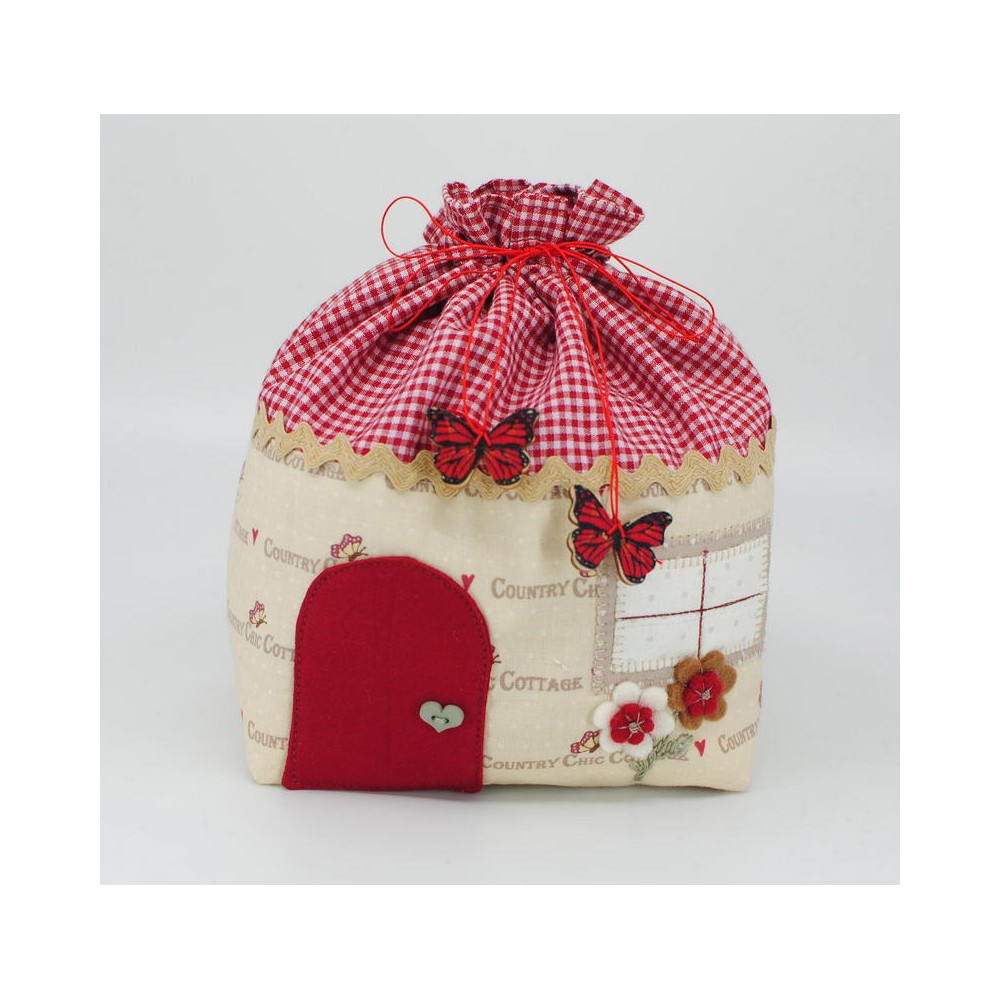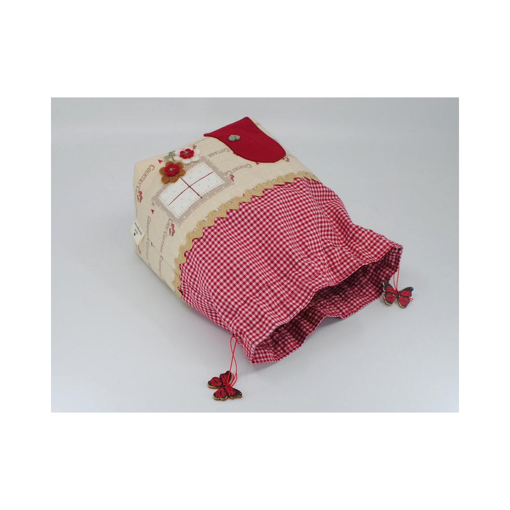 The cotton bag made from cotton is created like a little house/cottage, it is fully lined and closes with a drawstring.